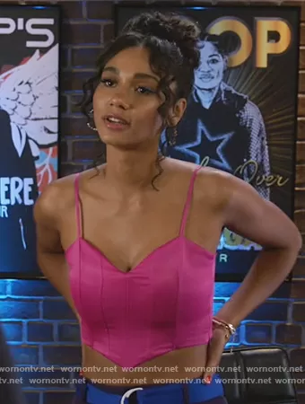 Layla Keating (played by Greta Onieogou) on All American on CWTV was spotted wearing this pink satin crop top on All American on episode 'Got Your Money' (4x09) in Mar 2022. Layla's Top is the Bustier Crop Top by Zara.