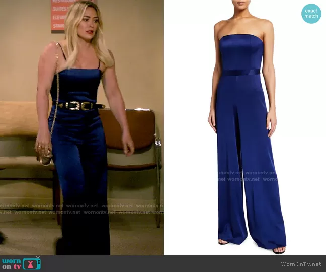Sophie (played by Hilary Duff) on How I Met Your Father on Hulu was spotted wearing this blue satin jumpsuit on How I Met Your Father on episode 'The Perfect Shot' (1x08) in Mar 2022. Sophie's Jumpsuit is the Athena Wide-Leg Bustier Jumpsuit by Alice + Olivia . Sophie's Belt is the Bri Bri Belt by B-Low the Belt . Sophie's Bag is the Nika Metallic Textured Round Crossbody Bag by Cult Gaia.