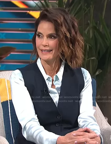 on E! News on E! was spotted wearing this Teri Hatcher’s navy vest and pants on E! News Daily Pop on Feb 28 2022's episode. 's Top is the Lapelless Vest by Zara