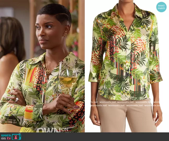 Rose King (played by Samantha Walkes) on The Kings of Napa on OWN was spotted wearing this tropical print shirt on The Kings of Napa on episode 'Dear Wine People' (1x04) in Feb 2022. Rose's Top is the Dani Top by L'Agence.
