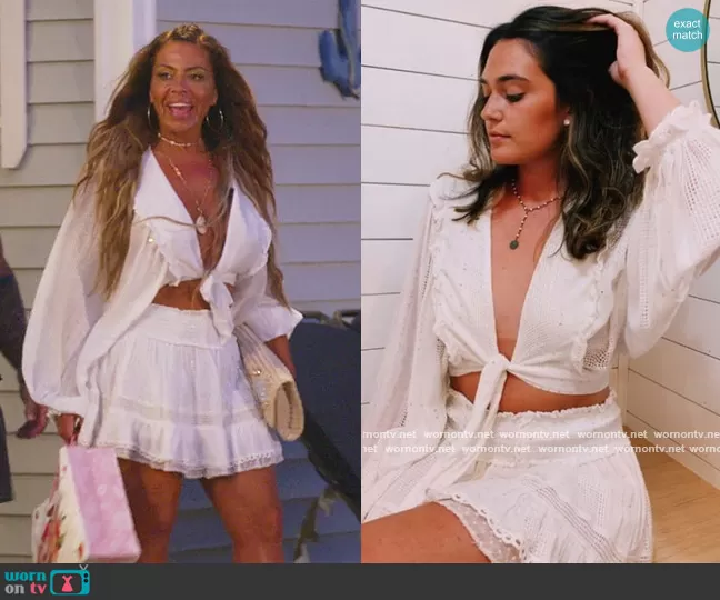 Dolores Catania on The Real Housewives of New Jersey on Bravo was spotted wearing this white tie blouse and skirt on The Real Housewives of New Jersey on episode 'Jersey Shore Showdown' (12x05) in Mar 2022. Dolores's Top is the Tie Waist Top by Surf Gypsy . Dolores's Skirt is the Embellished Skirt Swim Cover-Up by Surf Gypsy.