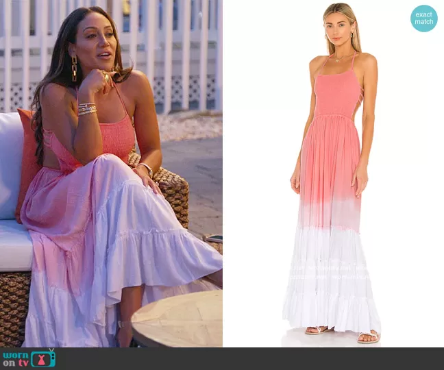 Melissa Gorga on The Real Housewives of New Jersey on Bravo was spotted wearing this pink ombre maxi dress on The Real Housewives of New Jersey on episode 'Jersey Shore Showdown' (12x05) in Mar 2022. Melissa's Dress is the Naia Dress by Tiare Hawaii.