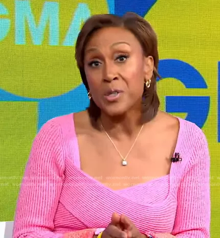Robin Roberts on Good Morning America on ABC was spotted wearing this pink ribbed knit dress on Good Morning America on Mar 02 2022's episode. Robin's Dress is the Portrait Neck Sweater Dress by 3.1 Phillip Lim.