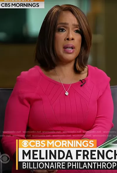 Gayle King on CBS Mornings on CBS was spotted wearing this fuchsia pink knit dress on CBS Mornings on Aug 07 2024's episode. Gayle's Dress is the Stitched Sweater Dress by Gabrielle Union Collection at New York & Co.