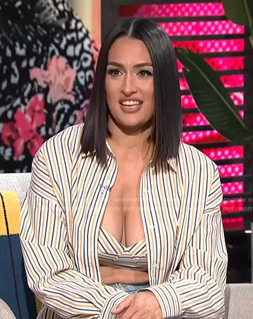 on E! News on E! was spotted wearing this Nikki Bella’s striped bra and oversized shirt on E! News Daily Pop on Mar 03 2022's episode. 's Bra is the Ex-Boyfriend Stripe Bralette by Favorite Daughter . 's Top is the Ex-Boyfriend Stripe Oversized Button-Up Shirt by Favorite Daughter.