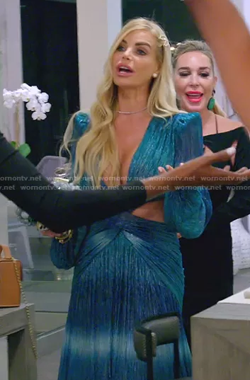 Alexia Echevarria (played by Alexia Echevarria) on The Real Housewives of Miami on Peacock was spotted wearing this blue metallic cutout maxi dress on The Real Housewives of Miami on episode 'Hamptons Hangover' (4x09) in Feb 2022. Alexia's Dress is the Cutout Twist-Front Ombré Lurex Maxi Dress by Patbo.