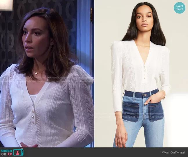Gwen Rizczech (played by Emily O'Brien) on Days of our Lives on Peacock was spotted wearing this white pointelle puff sleeve sweater on Days of our Lives on Mar 04 2022's episode. Gwen's Sweater is the Kirka Henley Pullover by Veronica Beard.