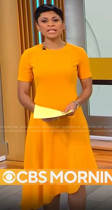 Jericka Duncan on CBS Mornings on CBS was spotted wearing this yellow asymmetric hem dress on CBS Mornings on Mar 04 2022's episode. Jericka's Dress is the Stretch Crepe Asymmetric Hem Fit and Flare Dress by Donna Morgan .