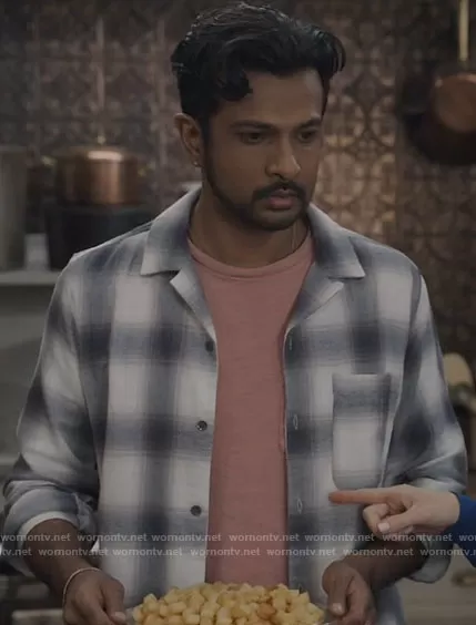 Jay (played by Utkarsh Ambudkar) on Ghosts on CBS was spotted wearing this white plaid shirt on Ghosts on episode 'Thorapy' (1x15) in Mar 2022. Jay's Shirt is the Flannel Camp Collar Shirt by Standard Cloth.