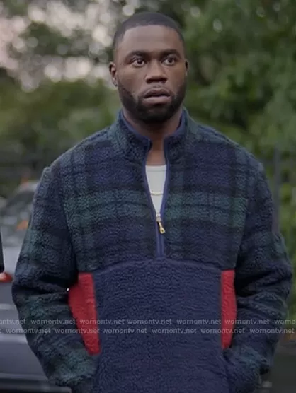 James (played by Garrick Bernard) on Single Drunk Female on Freeform was spotted wearing this plaid sherpa sweater on Single Drunk Female on episode 'James' (1x08) in Mar 2022. James's Sweater is the Sherpa Fleece Plaid Quarter-Zip Colorblock Sweater by Club Room.