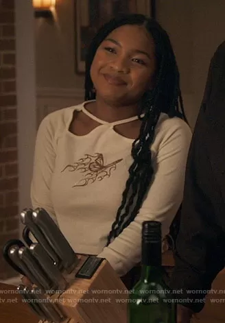 Delilah (played by Laya DeLeon Hayes) on The Equalizer on CBS was spotted wearing this butterfly top with cutouts on The Equalizer on episode 'Chinatown' (2x11) in Mar 2022. Delilah's Top is the Diamante Flaming Cutout Tee from Urban Outfitters.