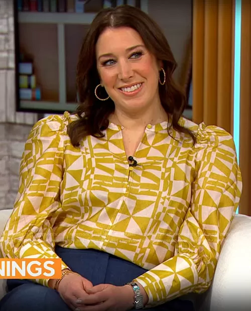 Sarah Gelman on CBS Mornings on CBS was spotted wearing this geometric print blouse on CBS Mornings on Mar 07 2022's episode. Sarah's Top is the Mitzy Keyhole Blouse by Baum und Pferdgarten .