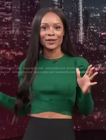 Zuri Hall on Access Hollywood on NBC was spotted wearing this green puff sleeve cropped sweater on Access Hollywood on Mar 07 2022's episode. Zuri's Sweater is the Cropped Ribbed Sweater by Zara.