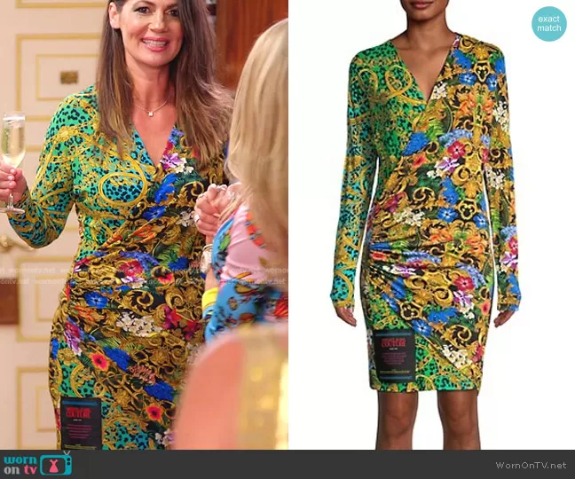 Julia Lemigova (played by Julia Lemigova) on The Real Housewives of Miami on Peacock was spotted wearing this mixed print surplice dress on The Real Housewives of Miami on episode 'Versace and Venom' (4x11) in Feb 2022. Julia's Dress is the Mix-Print Faux-Wrap Bodycon Dress by Versace Jeans Couture.