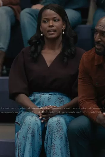 Vivian Banks (played by Cassandra Freeman) on Bel-Air on Peacock was spotted wearing this blue printed pants on Bel-Air on episode 'Yamacraw' (1x03) in Feb 2022. Viv's Pants is the Hortencia Ottoline Jacquard Wide-Leg Trousers by Erdem.