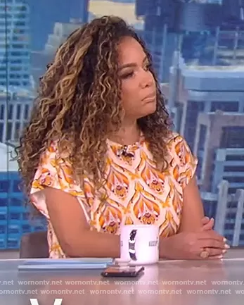 Sunny Hostin on The View on ABC was spotted wearing this orange floral gathered dress on The View on Mar 08 2022's episode. Sunny's Dress is the Printed stretch-jersey wrap-effect maxi dress by Paco Rabanne.