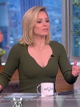 Sara Haines on The View on ABC was spotted wearing this green ribbed midi dress on The View on Mar 08 2022's episode. Sara's Dress is the Alessandra Ribbed Midi Dress by Khaite.