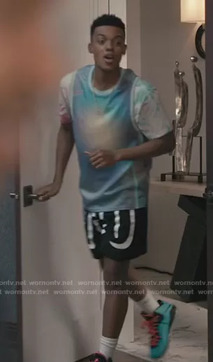 Will Smith (played by Jabari Banks) on Bel-Air on Peacock was spotted wearing this tie dye jersey on Bel-Air on episode 'PA to LA' (1x05) in Feb 2022. Will's Jersey is the Crossover Jersey in Gradient Burst Gray by Legends . Will's Shoes is the Lebron VII Sneakers in Black, Flash Pink & Green by Nike.