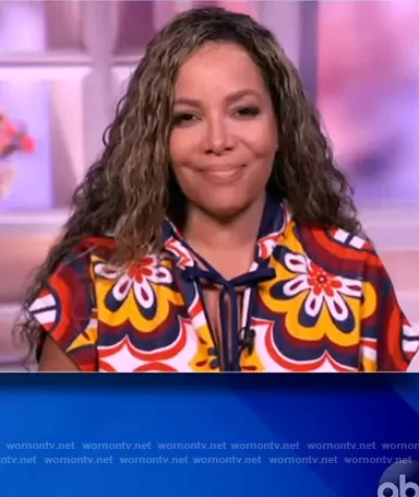 Sunny Hostin on The View on ABC was spotted wearing this floral print tie neck blouse on The View on Mar 10 2022's episode. Sunny's Top is the Ciccio hooded cotton-blend terry top by LA DoubleJ.