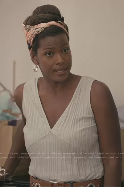 Vivian Banks (played by Cassandra Freeman) on Bel-Air on Peacock was spotted wearing this white v-neck top on Bel-Air on episode 'The Strength to Smile' (1x06) in Mar 2022. Viv's Top is the Crushed Double V Neck Tank by Vince . Viv's Belt is the Grommet Leather Belt in Copper by Lafayette 148 NY.