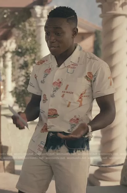 Carlton Banks (played by Olly Sholotan) on Bel-Air on Peacock was spotted wearing this Human Made shirt on Bel-Air on episode 'The Strength to Smile' (1x06) in Mar 2022. Carlton's Shirt is the Junk Food Vacation Shirt by Human Made . Carlton's Shorts is the Ralston Tie Dye Denim Shorts by Scotch & Soda.