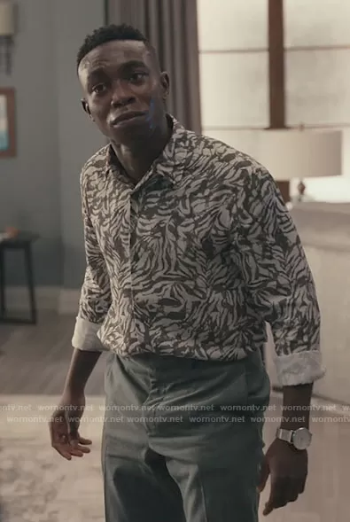 Carlton Banks (played by Olly Sholotan) on Bel-Air on Peacock was spotted wearing this green animal print shirt on Bel-Air on episode 'The Strength to Smile' (1x06) in Mar 2022. Carlton's Shirt is the Cellent Animal Shirt by Ted Baker.