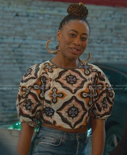 Malika Williams (played by Zuri Adele) on Good Trouble on Freeform was spotted wearing this printed puff sleeve top on Good Trouble on episode 'Turn and Face the Strange' (4x01) in Mar 2022. Malika's Top is the Gaia Geometric-Print Blouse by Ulla Johnson.