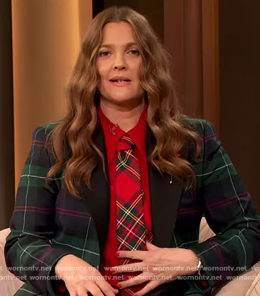 Drew Barrymore on The Drew Barrymore Show on CBS was spotted wearing this green plaid blazer and pants on The Drew Barrymore Show on Mar 10 2022's episode. Drew's Blazer is the Plaid One Button Blazer by Ralph Lauren . Drew's Pants is the Plaid Pants by Ralph Lauren.