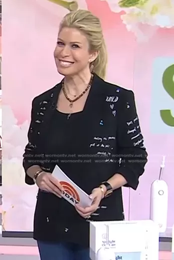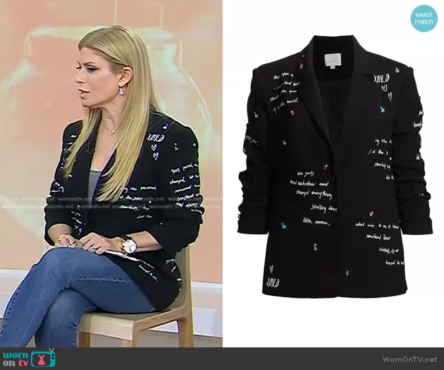 Jill Martin on Today on NBC was spotted wearing this black embellished printed blazer on Today on Nov 15 2022's episode. Jill's Jacket is the Loveletter Kylie Blazer by Cinq a Sept.
