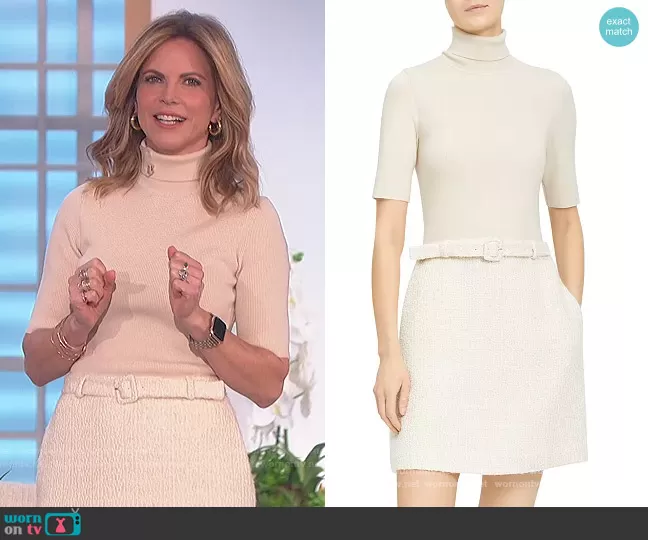 Natalie Morales on The Talk on CBS was spotted wearing this beige belted turtleneck dress on The Talk on Mar 10 2022's episode. Natalie's Dress is the Knit Combo Dress in Tweed by Theory.