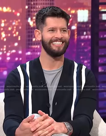 College Wool Striped Button Cardigan by Sandro worn by Hunter March on E! News Nightly Pop