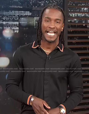 Scott Evans on Access Hollywood on NBC was spotted wearing this black striped trim shirt on Access Hollywood on Mar 10 2022's episode. Scott's Shirt is the Rainbow Striped Trim Shirt by Paul Smith.