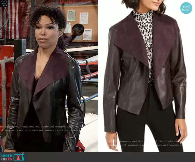 Portia Robinson (played by Brook Kerr) on General Hospital on ABC was spotted wearing this leather draped jacket on General Hospital on Mar 11 2022's episode. Portia's Jacket is the Modern Jacket by Bar III.