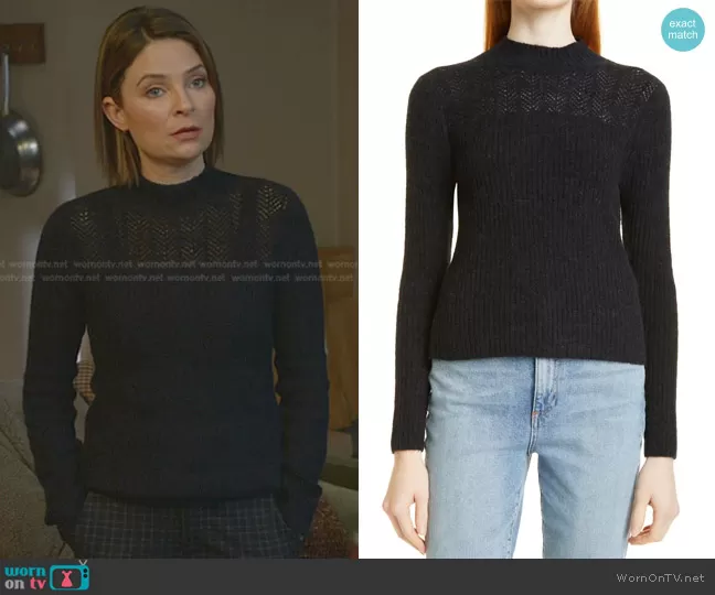 Taylor Rentzel (played by MacKenzie Meehan) on Bull on CBS was spotted wearing this black pointelle sweater on Bull on episode 'Safe Space' (6x14) in Mar 2022. Taylor's Sweater is the Pointelle Yoke Ribbed Sweater by Club Monaco.