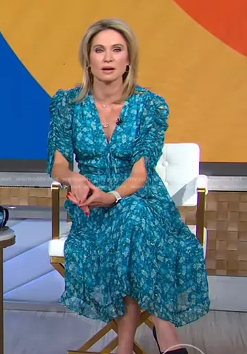 Amy Robach on Good Morning America on ABC was spotted wearing this blue floral ruched dress on Good Morning America on Mar 11 2022's episode. Amy's Dress is the Danli Floral Chiffon Midi Dress by Shoshanna . Amy's Necklace is the One Love Necklace in Blue by Ragen.