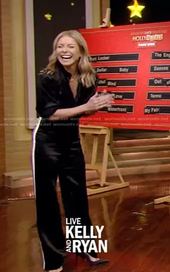 Kelly Ripa on Live with Kelly and Mark on Disney ABC Home Entertainment was spotted wearing this black blouse and side striped pants on Live with Kelly and Ryan on Jun 22 2022's episode. Kelly's Top is the Monogram Silk Jacquard Blouse by Saint Laurent . Kelly's Pants is the High-Waisted Satin Trousers by Lanvin.