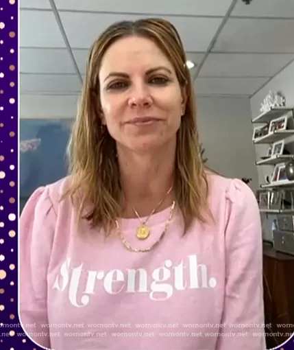 Natalie Morales on The Talk on CBS was spotted wearing this pink strength sweatshirt on The Talk on Mar 11 2022's episode. Natalie's Sweater is the Strength Sweatshirt by Talbots.