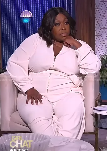 Loni Love on The Real on BETher was spotted wearing this ivory corduroy jumpsuit on The Real on Mar 11 2022's episode. Loni's Jumpsuit is the Corduroy Jumpsuit by Eloquii.