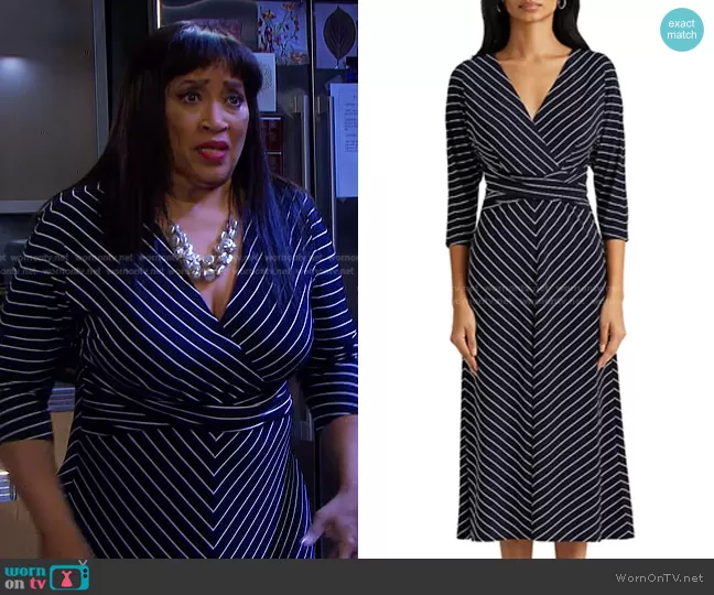 Paulina Price (played by Jackée Harry) on Days of our Lives on Peacock was spotted wearing this navy on Mar 12 2022's episode. Paulina's Dress is the Striped Jersey Elbow-Sleeve Dress by Lauren Ralph Lauren.