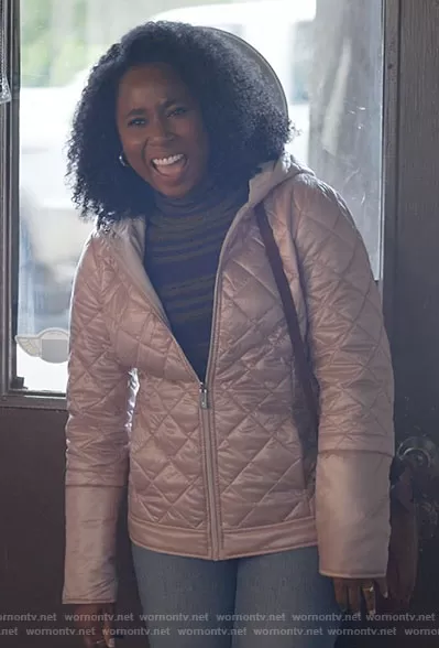 Brit Monclair (played by Sasha Compère) on Single Drunk Female on Freeform was spotted wearing this pink quilted jacket and striped turtleneck on Single Drunk Female on episode 'Higher Parent' (1x09) in Mar 2022. Brit's Sweater is the Harlee Striped Turtleneck Top by L'Agence . Brit's Jacket is the Reversible Hooded Puffer Jacket in Light Pink by Via Spiga.