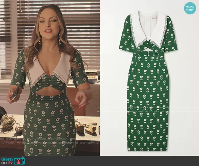 Fallon Carrington (played by Elizabeth Gillies) on Dynasty on The CW was spotted wearing this green floral cutout dress on Dynasty on episode 'How Did the Board Meeting Go?' (5x03) in Mar 2022. Fallon's Dress is the Lace Trimmed Midi Cutout Dress by Alexa Chung . Fallon's Bag is the Lena Epi Leather Clutch Bag by Louis Vuitton.