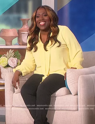 Sheryl Underwood on The Talk on CBS was spotted wearing this yellow tie neck blouse on The Talk on Mar 14 2022's episode. Sheryl's Top is the V-neck Long Sleeve Blouse by Black Label by Evan-Picone.