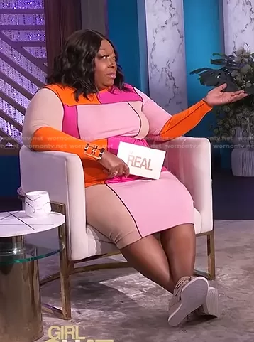 Loni Love on The Real on BETher was spotted wearing this pink colorblock dress on The Real on Mar 14 2022's episode. Loni's Dress is the Patchwork Dress by Eloquii.