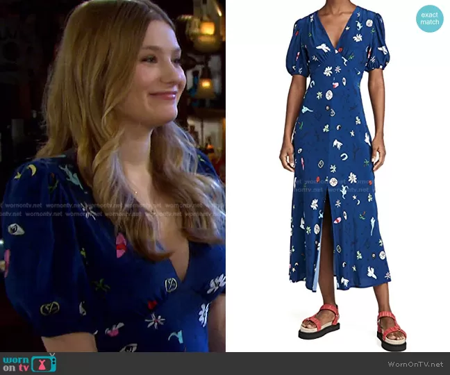 Alice Caroline Horton (played by Lindsay Arnold) on Days of our Lives on Peacock was spotted wearing this blue print v-neck dress on Days of our Lives on Mar 15 2022's episode. Allie's Dress is the Milla Dress by Staud.