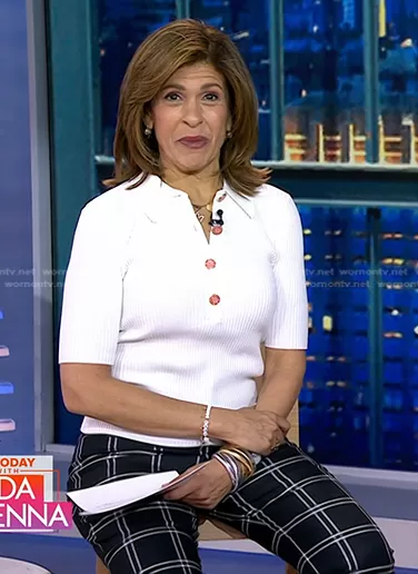 Hoda Kotb on Today on NBC was spotted wearing this white ribbed polo top and black check pants on Today on Aug 29 2022's episode. Hoda's Sweater is the Millenium Rib Sweater by Maje