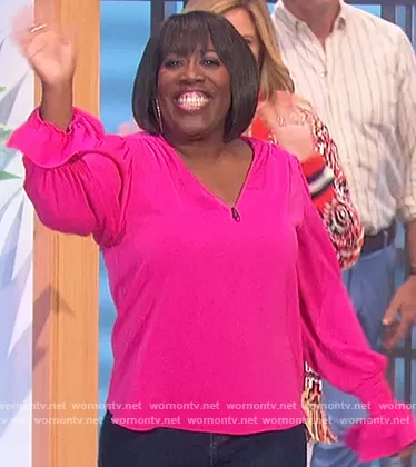 Sheryl Underwood on The Talk on CBS was spotted wearing this pink bell cuff top on The Talk on Mar 15 2022's episode. Sheryl's Top is the Puff Sleeve Top by Aqua.