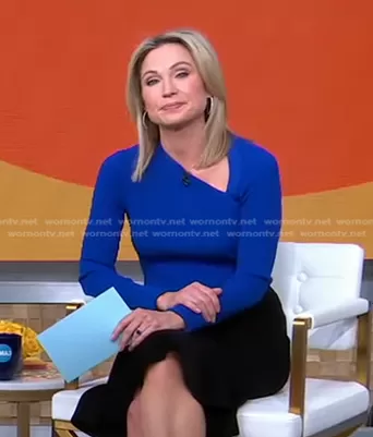 Amy Robach on Good Morning America on ABC was spotted wearing this blue asymmetric neck knit top on Good Morning America on Mar 15 2022's episode. Amy's Top is the Asymmetric Rib Knit Top by Helmut Lang.