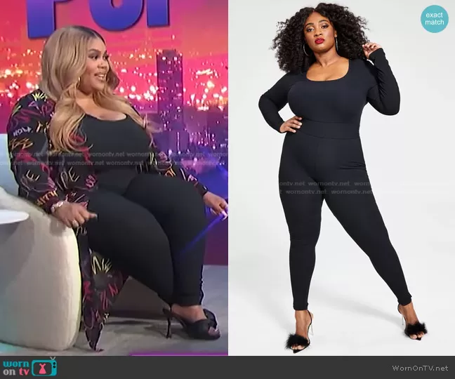 Nina Parker on E! News on E! was spotted wearing this black jumpsuit and printed sheer kimono on E! News Nightly Pop on Mar 15 2022's episode. Nina's Jumpsuit is the Trendy Plus Size Ribbed Jumpsuit by Nina Parker . Nina's Jacket is the Trendy Plus Size Printed Chiffon Duster by Nina Parker.