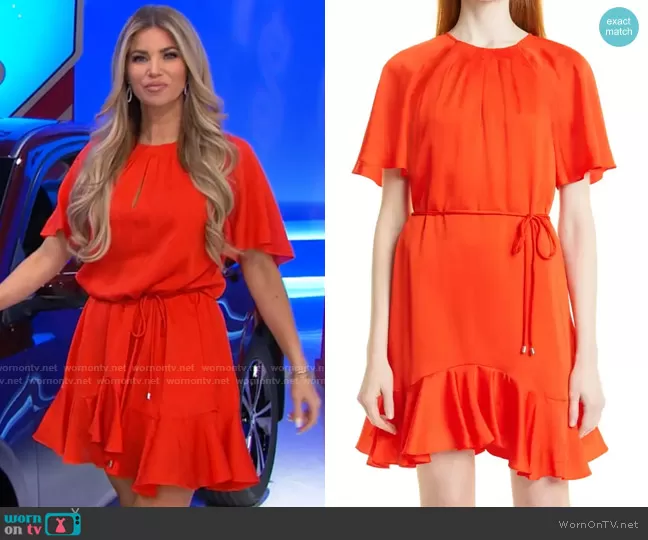 Amber Lancaster on The Price is Right on CBS was spotted wearing this orange tie waist dress on The Price is Right on May 23 2024's episode. Amber's Dress is the Elsiee Dress by Ted Baker.