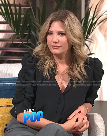 on E! News on E! was spotted wearing this black puff sleeve top on E! News Daily Pop on Mar 16 2022's episode. 's Top is the Shirred Sleeve Silk Blouse by Frame.